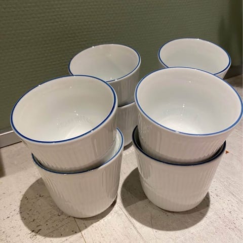 Har 5 kuverter med kopp/skål og tallerken. Pluss ekstra tallerk og kopp som har lite skall
