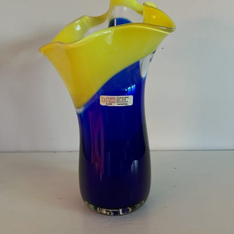 Meget pen fargerik glassvase fra portugisiske JM. Diameter ca 19 cm, høyde ca 17 cm. Kan sendes med postnord kr 69.