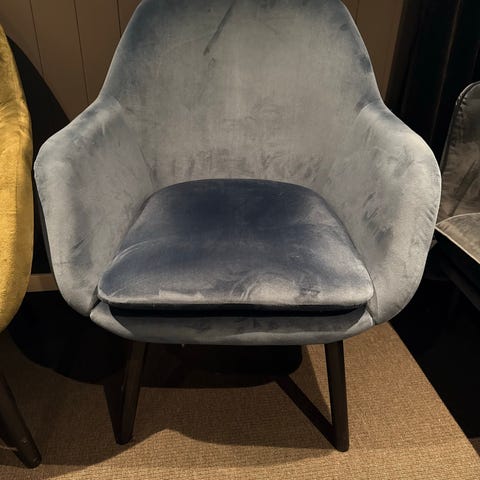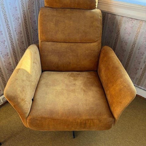 4 år gammelt, sjeldent brukt, (stått nesten som pynt), men også pent brukt sofa stol i velour stoff, (sennep gul farge), fra A-møbler.