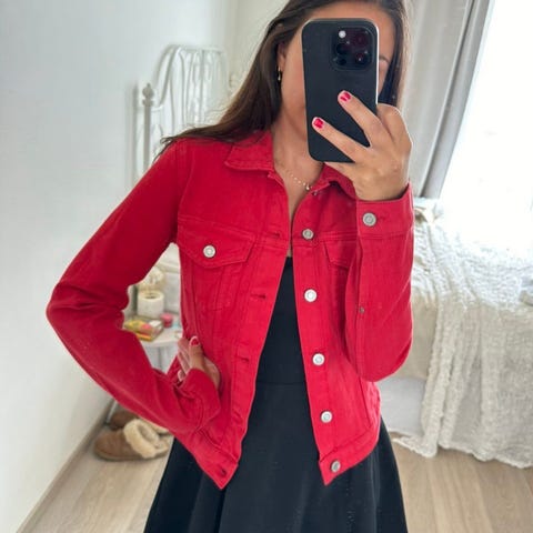 Flott lys blå denimjakke med lange ermer, krage og to brystlommer. Brystvidde 50 cm, lengde 48 cm. 98% bomull og 2% elastan. Tøff allsidig jakke.