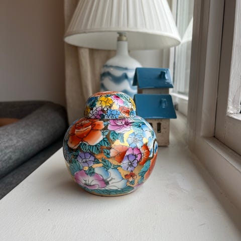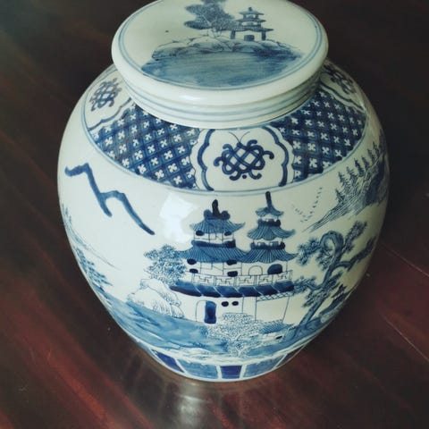 Håndlaget kinesisk porselen ingefær krukke. Høyde 22cm diamanter 22cm. Kan hentes ved Montebello t-bane stasjonen i Oslo eller sendes mot betaling.