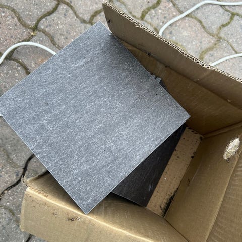 3 stk hvite og 3 stk grønne fliser, begge med «marmor» mønster. 33cmx20cm