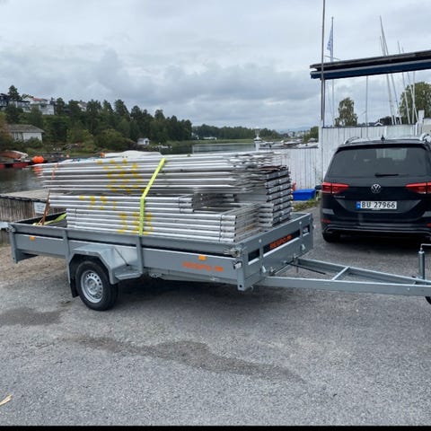 Tilhenger kan kjøres med B kategori. Det holder med liten bil, stillaset er ikke tungt.