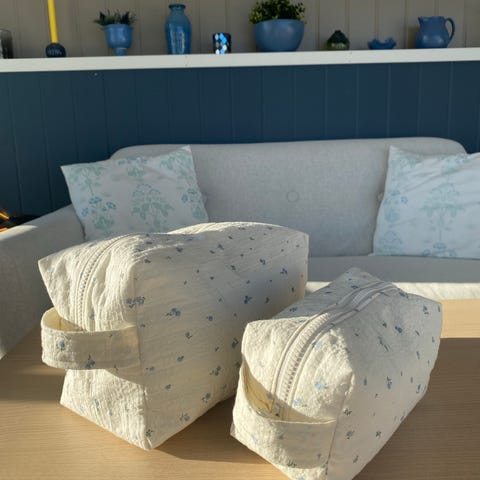Jeg syr praktiske toalettmapper i god størrelse. Jeg syr både av gjenbruksmaterialer som duker, gardiner, klær mm (selvsagt vasket/renset) men syr også av ny metervare.