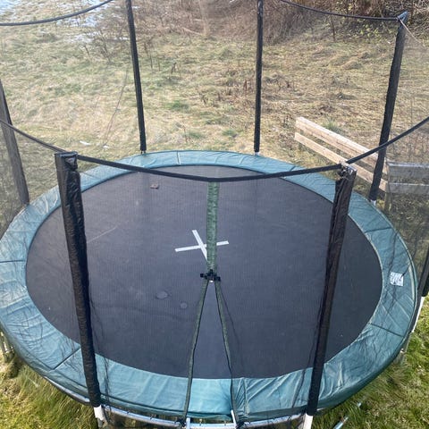 Kjøpt ny i juni 2021 og er dessverre lite brukt pga endra interesser hos barn. Stått ute korte sesonger og er oppbevart demontert innendørs om vinteren. Noen steder er det litt rust og slitasje, feks på stengene som holder nettet og på beskyttelseskanten på utsiden av sikkeethetsnettet og hoppeflaten. Sikkerhetsnett og duk i veldig god stand. Trampolinen fremstår i veldig god stand.