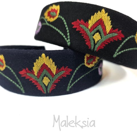 Designet har jeg stingsatt nøye til et maskinbroderi, med inspirasjon fra den nydelige Nordlandsbunden. Det er maskinbrodert på bunadsull og montert for hånd. Inni bøylen er det kledd med fløyel. Hårbøylene passer voksen og ungdom.