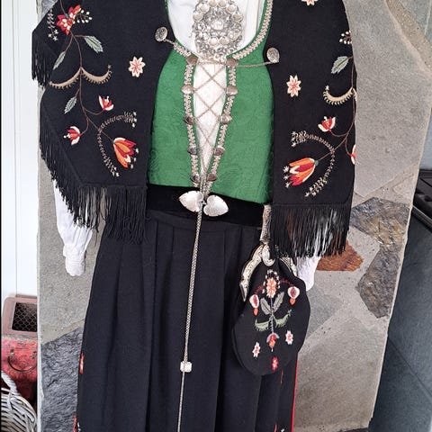 Løland bunad fra Husfliden, lite brukt. Selges uten veske, belte og sølv. Kun det sølvet som er på vest og cape. Livvidde er ca 90 cm, fra liv og ned ca 93 cm, brystvidde 100 cm og hel lengde er 134 cm.. Tilsvarer ca str. 42.