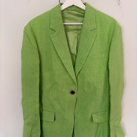 Veldig lite brukt jakke i merino selges. Den måler 70 cm fra krage til nedre kant på luggen. Modellen er oversized og passer størrelsen 36 til 38.