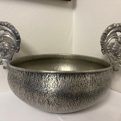 Denne er veldig gammel, godt over 100 år. Nydelig som pynt, som fruktfat, til dekorasjoner eller annet. Glassskålen har et par bittesmå hakk langs kanten, se bildene. Nå er den anløpt, har prøvd å pusse på den og da blir den blank. Meget vakker uansett. Ser ikke noe stempel.