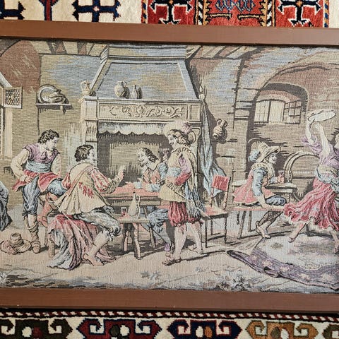 Ble brukt som veggteppe bak sofa uten rygg (Automan).