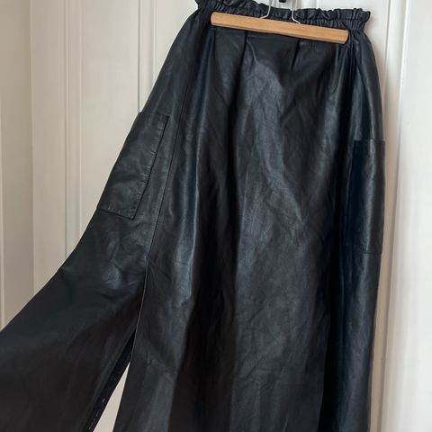 Vintage svart miniskjørt i skinn. Størrelse medium/large. perfekt silkefôr, knapp og glidelås bak. Vakker stil. Liten splitt foran gjør den veldig tiltalende!