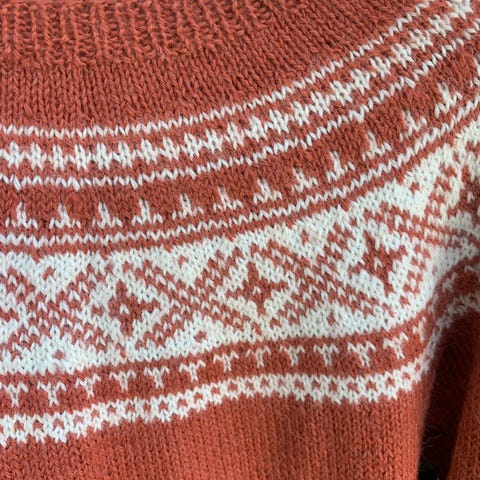 Genseren er strikket i Drops merino, er 100% ull.