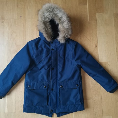 Selger en pent brukt mørk blå jakke med fuskepels rundt hetten.
