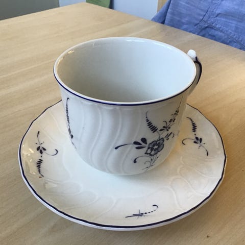 Keffeservice med 12 asjetter, 10 skåler og 8 kopper. To av koppene har skår( se bildet)