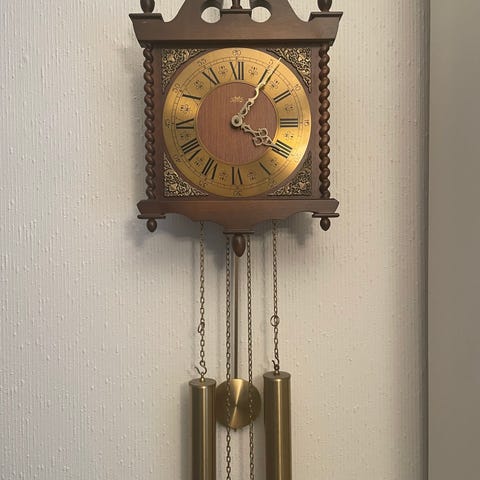 Hjemmeklokke håndmalt Denne veggklokken med vekter med har et mekanisk pendelverk.