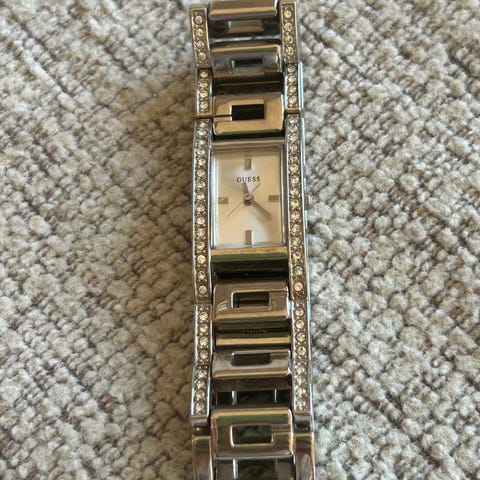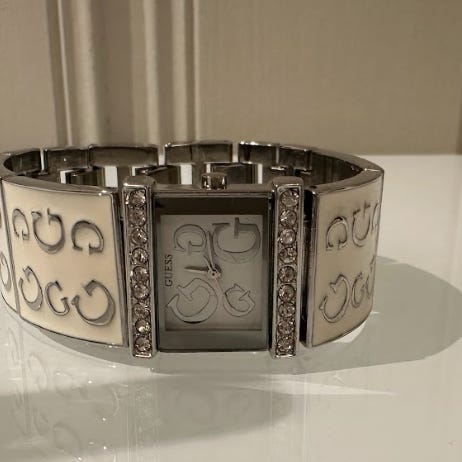 Et lite kupp! Ny, ubrukt i eske og med urkjøpsbevis, en rålekker klokke fra GUESS, ca år 2012! Klasssik hvit skive, med 4 Zirconia som viser klokken 3, 6, 9 og 12. Dobbel rand med tilsvarende Zirconia. Remmen er i mykt skinn, fremsiden i sort og hvit "pels" i sebramønster, med en rød kant på sidene.