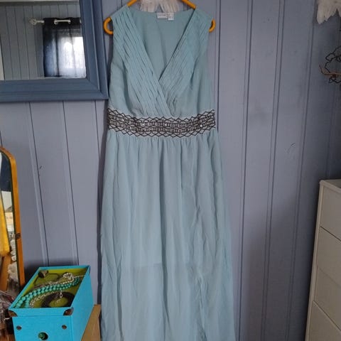 Nydelig sid kjole. Passer til str 36-38 Pris kan diskuteres, bør sees. Litt krøllete etter oppbevaring.