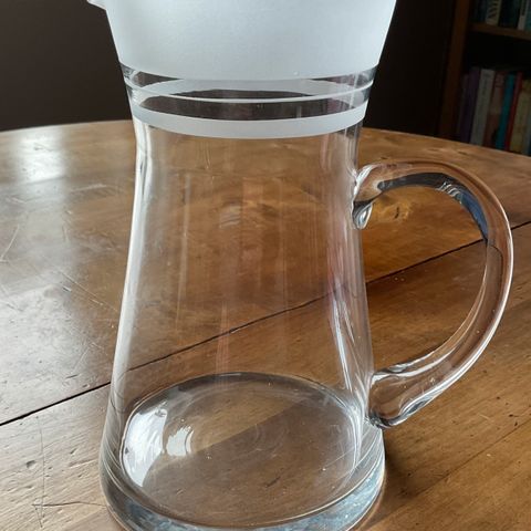 Denne muggen er fra Magnor sin Geilo-serie og gikk ut av produksjon på 1990-tallet. Kjennetegnes av boblene i glasset og det spesielle håndtaket. Den har noen små bruksmerker, men fremstår i meget god stand. Høyde 18,5 cm, diameter 10,5 cm.