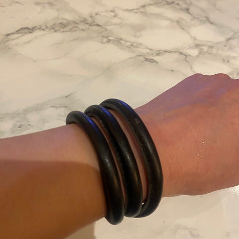 Vurderer å selge dette tøffe armbåndet. Cognacbrunt krokodilleskinn og 4 guloransje studs. Lengden kan reguleres med 3 ulike hull.