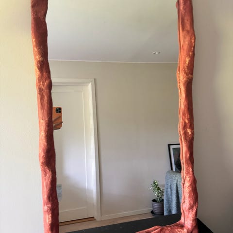 Antikt speil med vakre detaljer i sort og gull. Kjøpt på Rydeng Shop for kroner 5000-. Mål: 64 cm x 85 cm.