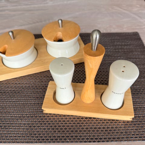 Koselige og artige salt og pepperbøsser, høne og hane med fin dekor.