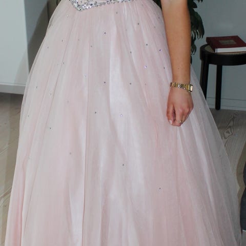 Aldeles nydelig ballkjole i fargen sølvblå, men er mest blå. Bildet gjengir det ikke helt nøyaktig, men har flere bilder hvis du ønsker det. Den har glitter i skjørtet og er utrolig fin. Kjolen har en høy splitt på den ene siden. (Har bilde, send pm hvis du ønsker det). Toppen er gjennomsiktig med unntak av brystpartiet, så man trenger ikke bh. Kjolen har åpen rygg og glidelås.