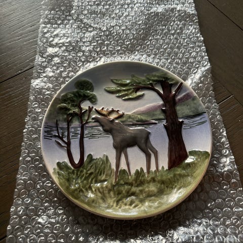 Kjeramikkfat med elgmotiv. Diam 23,5 cm. Har kun hengt på vegg. Ingen synlige slitasjemerker. Pen glasur.