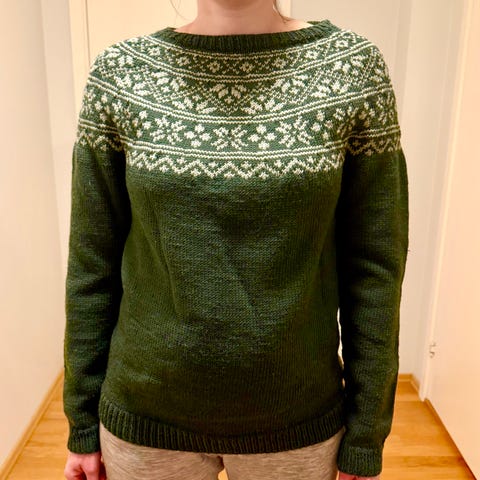 Flott genser som er strikket med mykt og kløfritt garn. Kun prøvd på siden den ikke passet, kan vaskes i maskin på ullprogram.