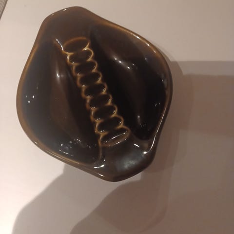 Eldre dekorativt askebeger fra Porsgrund Porselen. Stemplet under med logo og tallene 6057-2. Askebegeret er 15 cm langt / 13 cm bredt / 3 cm høyt.