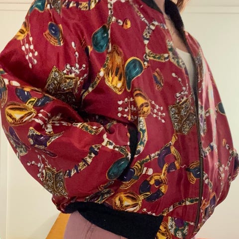 Stoffet har litt glans og fargen er friskt tomatrød - dette er et signaturplagg.