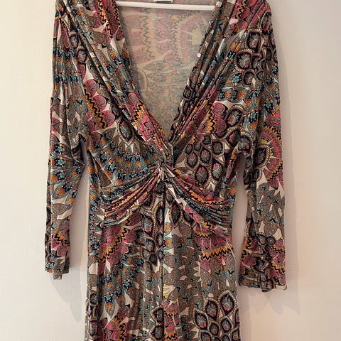 Odd Molly bluse /tunika/ kort kjole, flerfarget i størrelse S. Blusen har et dekorativt mønster på brun bunn, og er veldig komfortabel. Egnet for ulike anledninger.