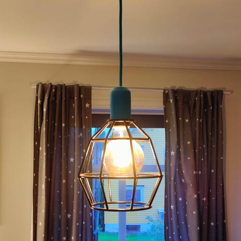 Taklampe fra @HOME på Grünerløkka. Svart, matt metallskjerm. Svart og hvit "stoffledning". Kan brukes med dimmer. Pære medfølger.