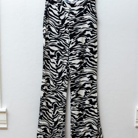 Zebramønstret bukse fra H&M Divided med vide ben og høyt liv. Merket med størrelse 38, men er litt liten i størrelsen-livvidde er 74-78 cm (stretch i stoffet), indre benlengde 79 cm og skrittlengde 30 cm. Laget av en blanding av bomull og elastan. Aldri brukt, lapp henger fortsatt på.
