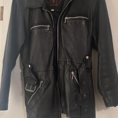Vintage skinnjakke selges. Har skulderputer og belte i livet. Beltet er ikke originalt, har selv kjøpt den brukt og beltet fulgte med. Veldig fin på.