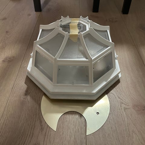 Taklampe av metall med fire armer som er svingbare. To sokler på hver arm. Armenes lengde 84 cm. Lampens høyde 50 cm. Ledningslengde 120 cm, tot. høyde 180 cm. Vaier for oppheng med regulerbar høyde. Krokoppheng. Takkopp av metall. 8xE27. Maks 40 W.
