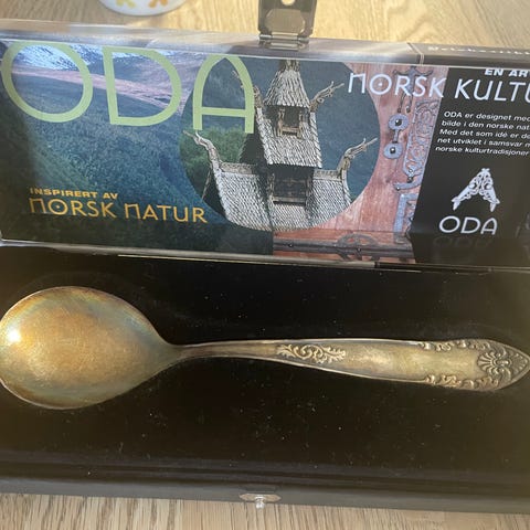 Selger pent brukt sylteskje i sølvplett, den er stemplet med N , Th .Marthinsen i Tønsberg sitt stempel for sølvplett samt 40 gram . Den har Ørsta Kyrkje motiv.