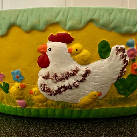 PÅSKE- 1 fin serviettholder. Høyden er 7,5 cm, lengde 10 cm, bredde 6 cm. Serviettholderen er hel og fin, kun noe av det gule er borte. Se bilder! Serviettholderen kan se de, eller hentes henting i Sandefjord, eller avtale og møtes i Tønsberg på Tolvsrød. Kan også sende via Finn.no «helthjem, koster kr. 82,- inntil 5 kg! Forsikret og med sporing.