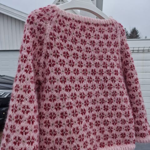 Turteldue genser fra Dorthe Skappel strikket i Faerytale garn. Hel lengde bak ca 73 cm foran 68 cm. Omkrets ca 102 cm. Kan sendes
