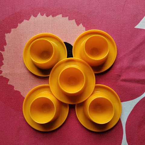 En samling div eggeglass i plast fra 60-tallet.