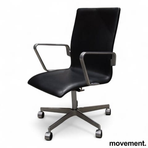 Ny betrukket i sort semianilin kvalitets skinn, stolen er forsynt med ''myke'' hjul (setter ikke merker på parketten) stolen har vipp og høydejustering.