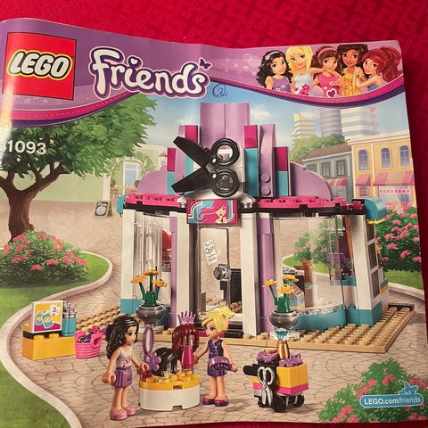 Lego frisørsalong. Det mangler to brikker (se bilder) og en figur er annerledes. Nypris 270kr.