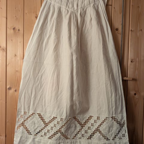 Underskjørt i lin. Oslo Barnekonfeksjon 16. Beregnet til livvidde 60 cm. Lengde 70 cm. Pent og velholdt.