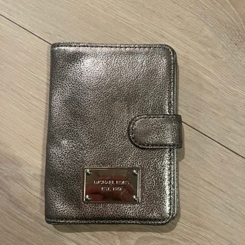 Sølv lommebok med lappen på fortsatt. Lommebok med glidelås lomme til mynt, to store rom hvor det er plass for sedler, 3 åpninger for plast til kort og ellers to plasser for annen oppbevaring billetter etc. Materiale stoff og borrelås.