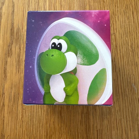 Selger en Yoshi Nintendo figur i plastikk fra McDonalds, 2014.