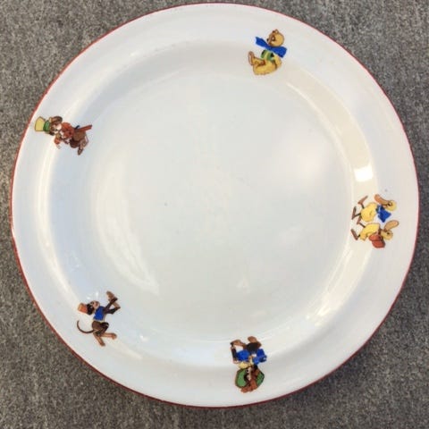 Gullkanten er slitt, og den har et merke / stripe, men ingen krakelering. Alt i alt en søt og sjarmerende barnetallerken med mye nostalgi.