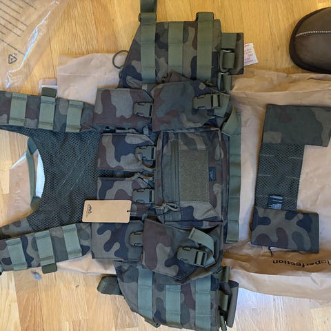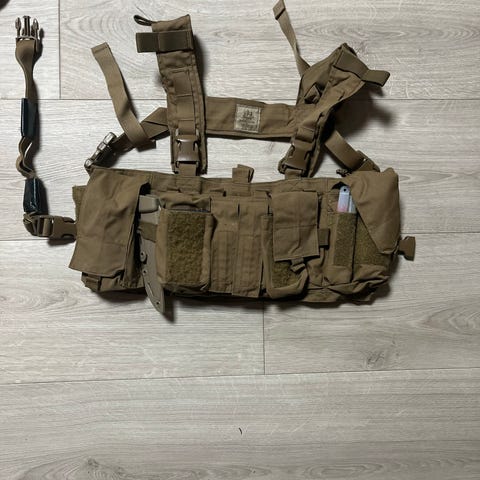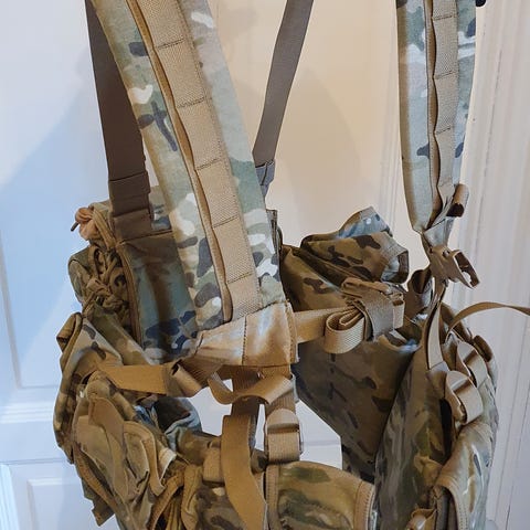 Split open chestrig. Sprayet hvit for vintercamo. Åpning foran gjør det lett å regulere bekledning om vinteren. Får plass til 6 magasiner og ellers alt du måtte trenge. Litt knot med LFR, men det går.