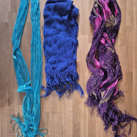 Selges separat eller samlet. Tre stk rutete trekantsjal; lyseblått, rosa eller brun/beige. Sølvtråder i alle. Egentlig firkantet (så kan helt sikkert bruker som duk om man heller skulle ville!), men lagt dobbelt, dermed oppleves det trykkere og varmere. Pris per stk. Evt. alle tre for 150 kr.