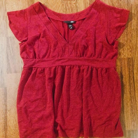 Lappen med størrelse er klippet vekk, men antar at det er en forholdsvis liten størrelse M, evt. en stor S. Romslig/løs modell i front. Noe lengre fremme enn bak, likevel forholdsvis god lengde også bak ift. størrelsen. Utringet modell. Nydelig, knall rødfarge (ikke oransje eller rosa). Svært tynt, nesten gjennomsiktig stoff, så svært godt egnet i varme (og tar minimalt med plass i en koffert)! Usikker på hva slags stoff, men tipper bomull eller viscose-blanding, ikke polyester i alle fall! Kjøpt for mange år siden, selges fordi den har krympet i skapet...🙈