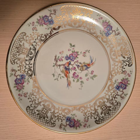 Gammelt og rustikt metall-fat med tre ben og hank. Hanken kan tas av og på. Blad- og druemotiv langs kanten. Diameter: 25 cm, høyde: 5 cm, høyde inkl. hank: ca. 20 cm. Fatet er ganske slitt, noe som gir det fin patina og shabby stil. Fint til småkaker eller frukt eller som pynt på veggen.