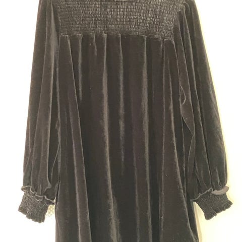 Gull/gul genser med trekvart ermer og glidelås ned ryggen. Rund hals. Ribb i alle ender. Litt stiv gullglans utenpå, myk, brushed på innsiden. Mangler stofflapp men gjetter bomull.